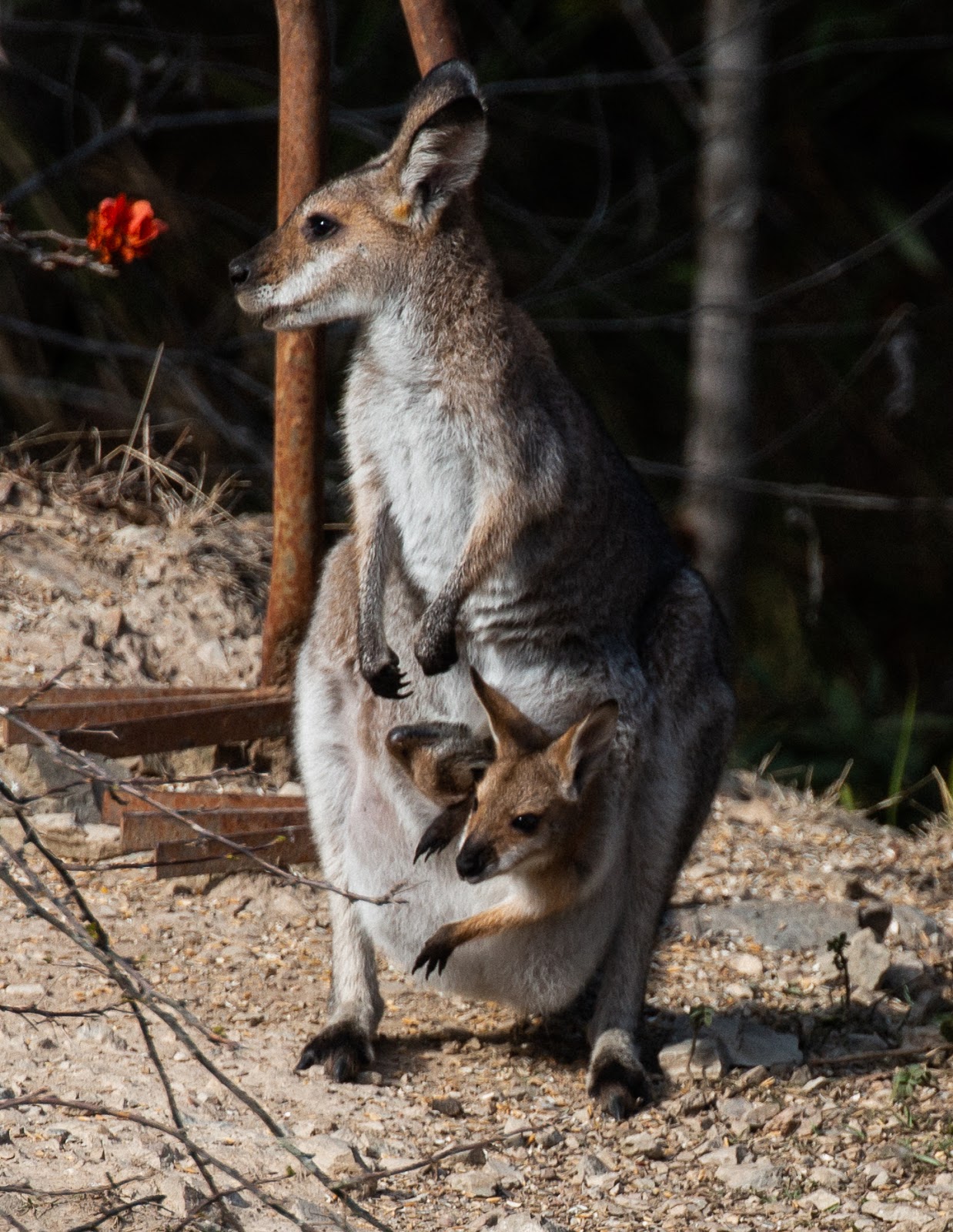 Our local mob of Red-necked Wallabies have become increasingly confident and now allow me to get within a dozen feet before bounding away, and even then they only hop a few bounds and then stop to watch what I'm up to. It's been a particularly dry season up till September and so they have been enjoying clearing up any missed grain around the bird tables and the chook pens.